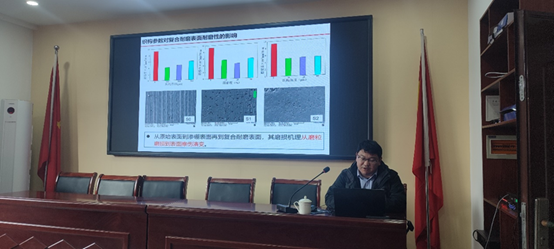 当天上午,张东亚博士开展了《固-液复合表面设计、制备及摩擦学性能研究》的学术报告。主要报道了以下内容:(1)低速大扭矩液压马达复合连杆制备及台架实验;(2)基于表面微织构硬质合金刀县切削技术研究;(3)DT300弹体表面渗硼强化的制备及其性能表征;(4)激光熔覆高熵合金涂层的关键工艺及在齿轮修复中应用研究;(5)硫系抗磨剂与石墨烯协同效应下铜合金板带轧制液。