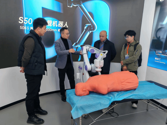 在江长根负责人的引导下,周振副院长一行先后参观了公司产品展示区与产品测试区,近距离了解企业在机器人技术研发、产品应用等领域的发展成果与技术优势,直观感受企业研发运营模式与岗位实操要求。