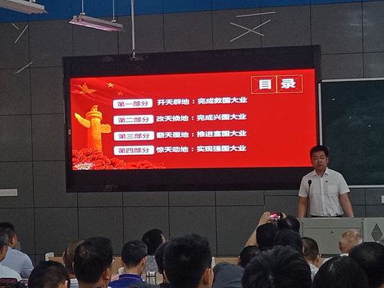 党课围绕“开天辟地 完成救国大业”、“改天换地完成兴国大业”、“翻天覆地 推进富国大业”、“惊天动地 实现强国大业”四方面展开。