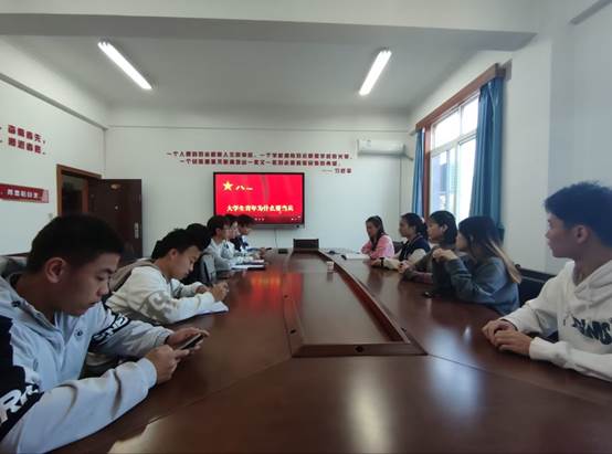 此处会议全体班委参与,由辅导员周攀老师主持,会议详细讲述了大学生入伍优惠政策,如:除享有优先报名应征、优先体检政审、优先审批定兵、优先安排使用“四个优先”政策,家庭按规定享受军属待遇外,还享受优先选拔使用、学费补偿和国家助学贷款代偿、退役后考学升学优惠、就业服务等政策。并播放了相关宣传短片以及相关红色军旅电影片段。